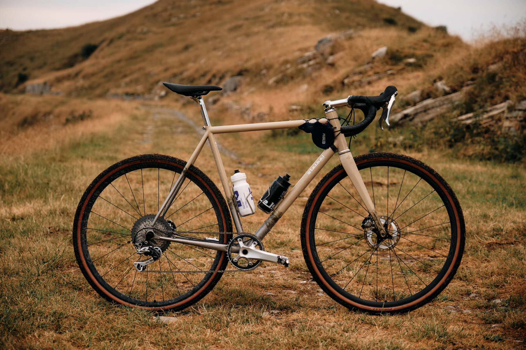 Leonardo rides our Stelbel Nina XCr, a stainless steel gravel frame built to adapt, endure, and accompany exploration. This specific Nina features a Sahara Beige fade finish, enriched with hand-applied olive green strokes and exposed natural steel details.